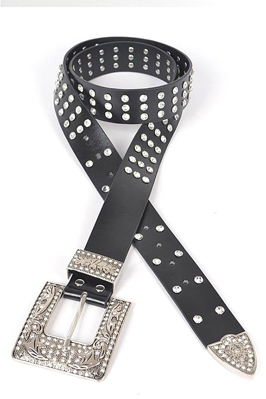 Elevate your style with the Engraved Buckle Crystal Metallic Belt, designed to beautifully complement plus size figures. Measuring 1.5\" in width and 52\" in length, this belt offers a perfect fit and bold presence. Crafted from durable polyurethane, accented with shimmering rhinestones and a mix of metals, it adds a touch of glamour to any outfit. The buckle closure ensures secure wear, while being lead and nickel compliant for safety and comfort. Experience a seamless blend of fashion and function, delivered to you within 5-10 business days. Make a statement every time you wear it.